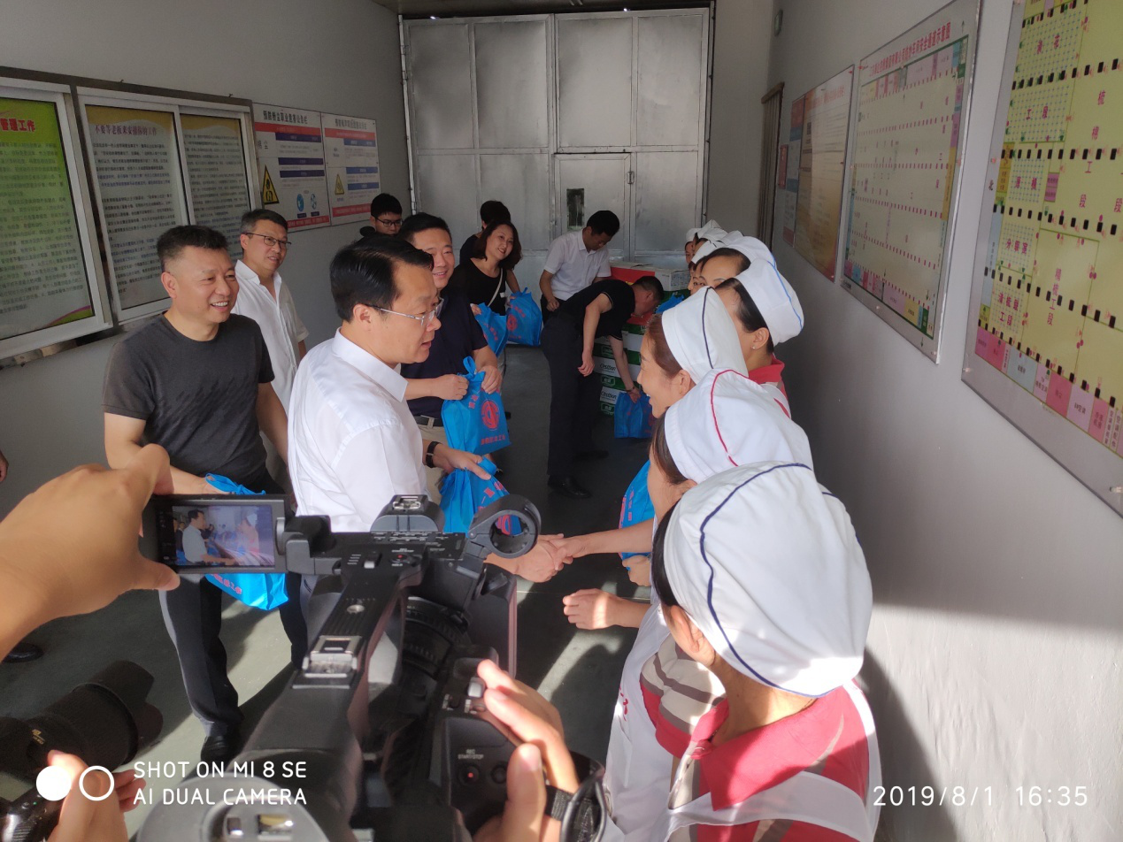 2019年建軍節下午,姜堰區區長冒著酷暑蒞臨江蘇泰達控股集團公司一分廠生產現場,為職工送清涼,慰問一線職工。